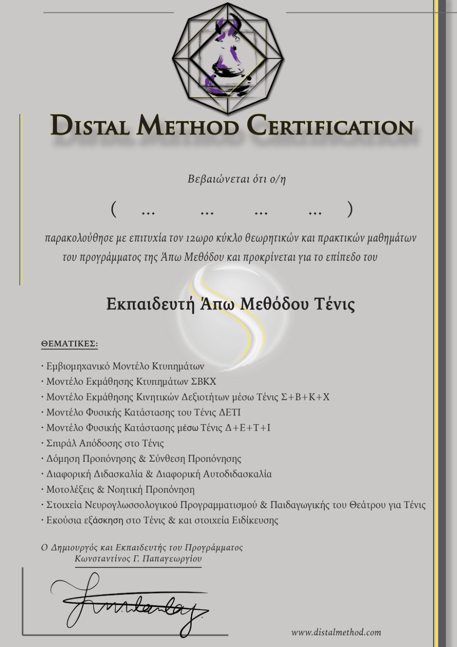 The Distal Method Tennis Certification (DMTC) is named after the Distal Method, both a methodology and a method for expertise attainment in motor skills of all kinds and in “related” cognitive skills (motor and cognitive skills are considered to be the two sides of the same coin, so to speak). Maybe the reader has been wondering what the components of a good tennis training session are. Or maybe they have a good grasp of that and feel that something’s missing. Well, many things are missing in the current tennis-training Paradigm and the DMTC has been created to address all of the related issues; be them known or unknown to the athlete/parent/trainer – with the emphasis on the latter. It is important to understand why DMTC is, by design, the most comprehensive training method. In order to see that, one ought to appreciate both the conception and the breakthroughs of the original and more general Distal Method that make it unique in many aspects; practically speaking, one just has to do the simplest possible calculation: how many aspects of player development does the tennis Distal Method cover, and how many tools it provides. This certification program provides a set of tools that have not existed before, all within a different Paradigm that is truly holistic and does not only address the development of effective skills and motor expertise – as if these weren’t already enough for any training system. The interested coach who is abroad may contact Dr Papageorge directly or his team for a live seminar or may find the online course more practical due to travel restrictions or simply due to distance considerations (Dr. Papageorge is based in Greece). In the link below one may find both the online tennis Distal Method Coach Development program and the curriculum.